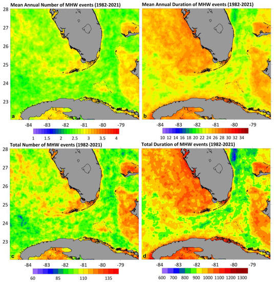 The formation of MHWs was computed and analyzed for the entire study region, and for the whole time period. Both the annual number of MHW events and their total annual durations (days), which were averaged over the South Florida domain, revealed an increasing trend during the 40-year period and are statistically significant (pvalue < 0.01; Figure 6a). The increase of the total annual MHW days was 7.4 days/decade, and the respective increase of the MHW events was 0.75 events/decade. Three large peaks were computed in 2015, 2019, and 2020, respectively, with more than 8 MHWs lasting around 70 to 110 days in total, constituting the high peaks of the mean SST values presented in Figure 3a. The prolonged period of low SST levels reported during the 2004–2013 decade (Figure 3a) agrees with the low number of MHWs events (<4) and days (<40) (Figure 6a). However, the period with the lowest SST levels in 2010 does not coincide with the lowest MHW events since the reduced SST were mainly associated with the very cold waters of the winter months. The last seven years (2015–2021) revealed the highest number of events and durations among all study years, with the exception of 2018, when very few (4) and short (<40) MHWs that were observed in the South Florida region.