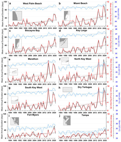 Interannual variability of annual mean number (red solid line), duration (days; black solid line) of MHW events, the mean annual SST (°C; blue solid line) over (a) West Palm Beach, (b) Miami Beach, (c) Biscayne Bay, (d) Key Largo, (e) Marathon, (f) North Key West, (g) South Key West, (h) Dry Tortugas, (i) Fort Myers, and (j) Tampa from 1982 to 2021. The insert maps show the satellite grid points used for the computation over each area. The respective linear trends are also indicated with dashed lines.