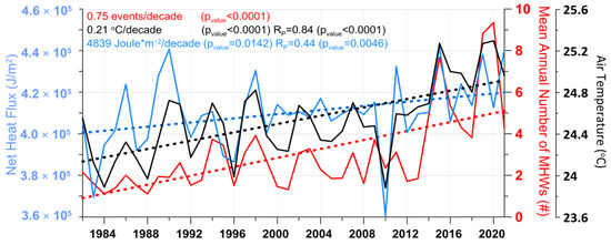 Annual variability (continuous lines) and trends (dashed lines) of the mean annual number of all Marine Heat Waves (MHWs; red line), the air temperature (°C; black line), and the surface net heat flux (J/m2; blue line). The Sen’s Slopes and the Pearson correlation coefficients between both atmospheric variables (air temperature and heat flux) and the number of MHWs are presented. The pvalues of the MK trend and correlation tests are also shown.