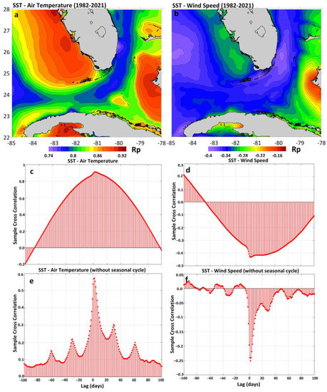The wind speed also contributes to the variability of the SST, showing negative Pearson coefficients (counter-correlation) over all areas (Figure 10b). High SST anomalies usually coincide with weak wind anomalies throughout the study period. The strongest impact of the wind on SST was detected over the broader Miami area (25–26° N) with correlation coefficients close to −0.40. The majority of the Straits of Florida showed correlation coefficients around −0.35, while the smallest values were computed for the Bahamas, where the air temperature effect is stronger (Figure 10a). Relatively weak correlation (Rp = −0.29) was also detected along the western coast of Florida and north of the Florida Keys. Generally, the impact of the wind on SST is weaker and more spatially homogenous compared to the air temperature effect. The general correlation coefficient, derived from all daily values is approximately Rp = −0.43 and reveals the same small lag (~3 days) for seasonal (Figure 10d) and non-seasonal (Figure 10f) timeseries. The correlation coefficient of the non-seasonal correlations, which is derived from variations related to extreme events is smaller and equal to −0.25.
