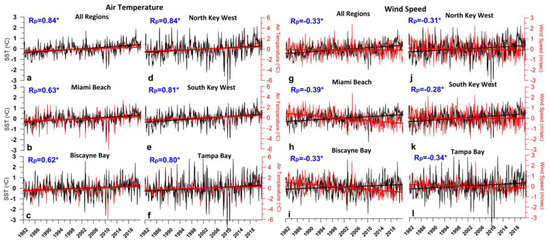 Monthly evolutions, without the seasonal cycle, of the Sea Surface Temperatures (SST anomaly, black line, °C), air temperature (red line in upper panels; °C) and wind speed (red line in lower panels; m/s), averaged over: (a,g) All Regions (entire study domain); (b,h) Miami Beach; (c,i) Biscayne Bay; (d,j) North Key West; (e,k) South Key West; (f,l) Tampa Bay, over the 1982–2021 period (areas marked in Figure 8). The linear trends and the Pearson correlation coefficients (Rp) for each case are shown. The asterisks (*) indicate statistically significant correlations of 99%.