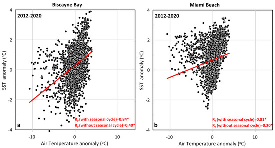 Scatter diagram of daily SST and air temperature anomaly (seasonal cycle excluded), derived for (a) Biscayne Bay, and (b) Miami Beach covering the 2012–2020 period. The air temperature measurements were collected at the NDBC FWYF1 station located at the coastal area of Miami (Figure 1). The linear regressions (red lines) and the correlation coefficients (Rp) with and without the seasonal cycle are also shown. The asterisk (*) indicates that the hypothesis that the correlation is statistically significant is true (99% MK trend test: pvalue < 0.01).