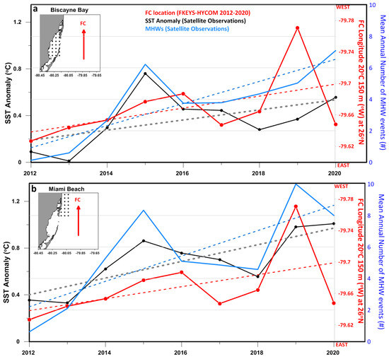 Annual mean of SST anomaly (black line), mean annual number of MHW events (blue line), and Florida Current (FC) longitude based on the 20 °C temperature contour line at 150 m along 26° N that is derived from the FKEYS-HYCOM numerical simulations for (a) Biscayne Bay, and (b) Miami Beach during the 2012–2020 period. The maps in the inserts represent the area used to estimate the SST anomaly and the MHW events. The linear trend (dashed line) for each case is also presented.