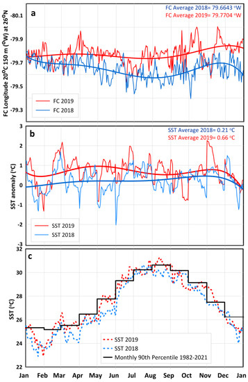 Daily evolution of (a) the Florida Current (FC) longitude, based on the 20 °C temperature contour line at 150 m along 26° N that is derived from the FKEYS-HYCOM numerical simulations, the Miami Beach Sea Surface Temperature (b) without (SST anomaly) and (c) with the seasonal cycle (satellite observations) for 2018 (blue lines) and 2019 (red lines). The mean monthly 90th percentiles of SST derived for the Miami Beach coastal area from the 1982–2021 satellite dataset (black line) is presented in (c). The 6th order polynomial fits and the annual means of the FC longitude and the SST for each year are also shown.