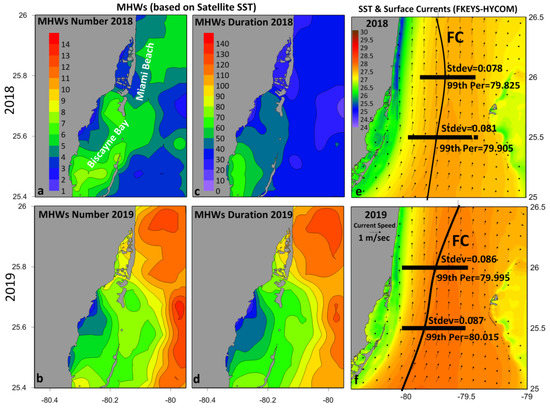 Horizontal distribution of (a,b) MHWs number, (c,d) MHW duration for 2018 and 2019, derived from the satellite SST dataset over Biscayne Bay and Miami Beach. The SST, the surface currents and the position of the FC front (black lines along the Straits), derived from the FKEYS-HYCOM simulations are averaged over (e) 2018 and (f) 2019. The Miami Beach and Biscayne Bay areas are marked in (a). The horizontal thick lines consists of all daily FC positions at 25.5° N and 26° N for years (e) 2018 and (f) 2019 together with the Standard Deviation (Stdev) and 99th Percentile (Per) of the annual longitude positions.