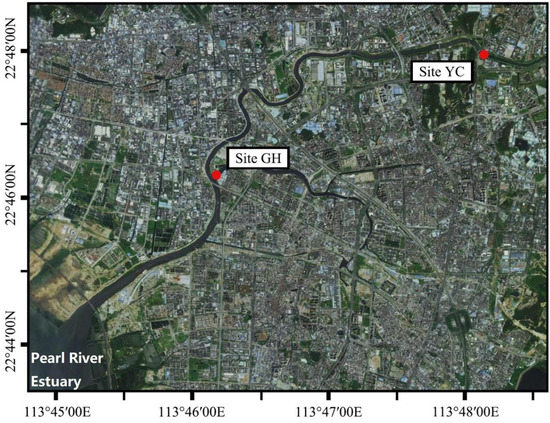 The Maozhou River (22°39′–22°48′ N, 113°44′–113°56′ E) is located in the northern part of Shenzhen [22]. It is the longest urban river in Shenzhen and has the largest river basin area. The river water passes through the rapidly urbanized and industrialized regions of northwestern Shenzhen and then flows westward into the Pearl River Estuary [23]. The average annual temperature of the river is 22.4 °C. Two sampling sites (GH: Gonghe Village (latitude: 113.7906843424; longitude: 22.7542931558) and YC: Yanchuan (latitude: 113.8547998663; longitude: 22.7928884860)) were located downstream of the Maozhou River (Figure 1). At each site, 500 mL of surface water samples (0–50 cm) were collected using sterile canisters; water collection was repeated three times and the samples were mixed to get a 1.5 L composite water sample. Mud samples (≥5 g) (0–10 cm) were also collected from three different sampling points and mixed into sterilized 50 mL centrifuge tubes to get a composite mud sample (Guangzhou Jet Bio-Filtration Co., Ltd., Guangzhou, China). Samples were collected and performed during four seasons (October, January, April, and July; Table 1). Water was first filtered using a peristaltic pump with 0.8–8 μm filters and then passed through 0.22 μm glass fiber filters (Merck KGaA, Darmstadt, Germany). All samples were stored at 4 °C for a maximum of 24 h before they were processed and glass fiber filters and mud samples for DNA extraction and PCR amplification were stored at −80 °C.