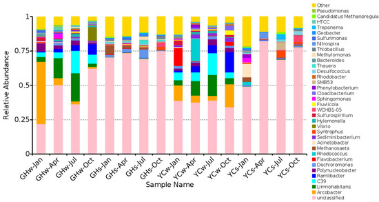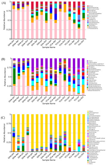 At the phylum level (Figure 2A), Proteobacteria was dominant (58.89 ± 4.47%) in all samples, followed by Bacteroidetes (8.48 ± 1.30%), Actinobacteria (5.48 ± 0.91%), and Chloroflexi (5.22 ± 1.53%). The top four phyla accounted for 78.07 ± 0.08% of the total OTUs. Proteobacteria had the highest abundance in the GHw-Oct sample (87.99%), while the highest relative abundance of Bacteroidetes was found in the YCw-Oct sample (22.59%). The highest abundance of Chloroflexi (19.95%) and Acidobacter (14.52%) were observed in the GHs-Oct and YCw-Apr samples, respectively. Specifically, the water samples from YC in April and January (YCw-Apr and YCw-Jan) showed a relatively high abundance of Saccharibacteria (15.84% and 14.63%, respectively).