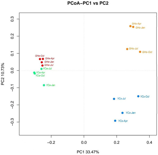 The top five genera from the GH and YC sites were as follows: Vibrio, Arcobacter, 12up, Limnohabitans, and Caldisericum (Figure 2C). Except for Caldisericum, which belongs to the Caldiserica phylum, the others belong to the Proteobacteria phylum. The relative abundances of Vibrio (43.83%) and Arcobacter (38.52%) were the highest in the GHw-Oct and GHw-Jan samples, respectively. The YCs-Jul and YCs-Jan mud samples showed the highest relative abundances of Caldisericum (13.63%) and Acinetobacter (7.46%). It is worth noting that the dominant genus in most water samples was Arcobacter. At the same time, a relatively higher abundance of the genus 12up was found in the water samples in July at both sites (YC and GH) when compared to the other samples.