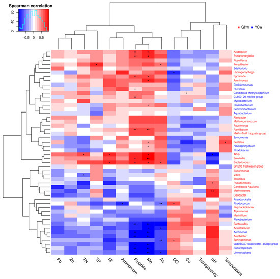 Correlation analysis between the microbial species and environmental factors from all water samples. Each row represents a microbial species and the color of the species name indicates the species that are enriched in the corresponding color group in the upper right corner. The columns represent environmental factors. In the plot, blue-colored boxes represent negative correlations and red-colored boxes represent positive correlations; the darker the color, the stronger the correlation. The * in the figure indicates a p-value < 0.05, and the ** in the figure indicates a p-value < 0.01.
