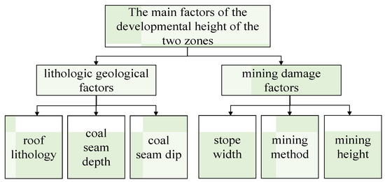 The development height of caving zone and fissure zone in the “three zones” of mining overburden is affected by many factors, mainly involving geological factors and mining factors. The differential interaction between the factors makes the development heights of the two zones fluctuate greatly in different regions. After reviewing much of the literature and geological reports, the factors affecting the height of overburden damage in coalfield mining such as roof lithology, coal seam depth, mining height, mining operation method, stope width, etc., are shown in Figure 4.