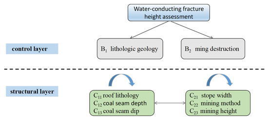 Combined with the lithological and geological background of Yingpanhao Coal Mine, the main factors for the development of roof water-conducting fracture zones are classified according to their attributes and a three-cluster ANP network model is established as shown in Figure 6.
