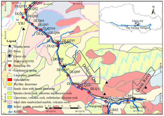 Geothermal water is formed in the subsurface rock and has a heat source [26]. It has been found that the temperature of geothermal water can be as high as 289 °C [14]. Therefore, the discharge of geothermal water will cause the temperature of the surrounding rivers to rise and reduce the dissolved oxygen content (DOC) of the rivers, resulting in the deterioration of water quality. The high temperature and water–rock interaction make the geothermal water dissolve abundant anions and cations, with a high degree of mineralization [27]. Previous studies have confirmed that the geothermal water inflow affects the water quality of surrounding rivers [28]. For example, the concentrations of K+, Na+, Cl−, and SiO2 of the river water downstream in the Zaotang River (China) increased due to the inflow of hot spring water from the Rehai geothermal field [28]. Thorsten et al. [29] showed that concentrations of Mn, Zn, and Cu in Río Vacas Heladas (Chile) exceeded WHO guideline values for drinking water. Timperley et al. [30] estimated that 78% of the Cl− in the Waikato River (New Zealand) comes from geothermal fluids. More and more studies are proving the impact of geothermal water on rivers related to river runoff. The Büyük Menderes River (Turkey) runoff exceeded 26.651 m3/s, and the emission of geothermal waters into the streams did not result in any environmental problems [31]. Blaine et al. [32] found that the fraction of the Yellowstone River (USA) from geothermal sources was about 0.2% during the high-flow season and 6.5% during the low-flow season. In addition, geothermal fluids contain very high concentrations of harmful chemical components, especially arsenic (As) [14]. Arsenic concentrations in water at El Tatio (Northern Chile) [33], Waikato River (New Zealand) [34], and Yellowstone National Park (USA) [35] were reported to be as high as 27,000 mg/L, 3800 mg/L, and 7800 mg/L, respectively. Thus, it was inferred that the discharge of geothermal water, which contains high As concentrations, might be a reason for the high As concentration and accumulation in the surrounding rivers. It is known that the long-term intake of high concentrations of As may induce endemic As poisoning [23]. Therefore, it is worth paying attention to the impact of geothermal water on the surrounding water quality. The TP is a region of intense geothermal activity in China [14]. The Lhasa River (LR) basin is situated in the mid-southern TP and is the main principal tributary of the middle Yarlung Tsangpo River [13]. As the core area of politics, economics, culture, transportation, and religion in the Tibet Autonomous Region, the LR basin is essential to Tibet’s socioeconomic development [5,13]. The Duilong Qu (DLQ, Qu means river in the Tibetan language), a major tributary of the LR, is located downstream from the town of Yangbajing (YBJ) [12,23]. The YBJ geothermal field is the largest geothermal field on the TP, with the highest heat storage temperature (average temperature of 248 °C) in China [23]. Previous studies on YBJ geothermal water and surrounding areas have mainly focused on regional and geothermal geology [36]. However, it is still unclear how geothermal water discharge impacts the water quality of the DLQ. Thus, when the geothermal water and domestic sewage of surrounding residents flow into the DLQ [23], the water quality of the DLQ may be at risk of contamination [14,23]. As the water source for the production and living of residents [23], the water quality safety of the DLQ is a severe issue for the residents.