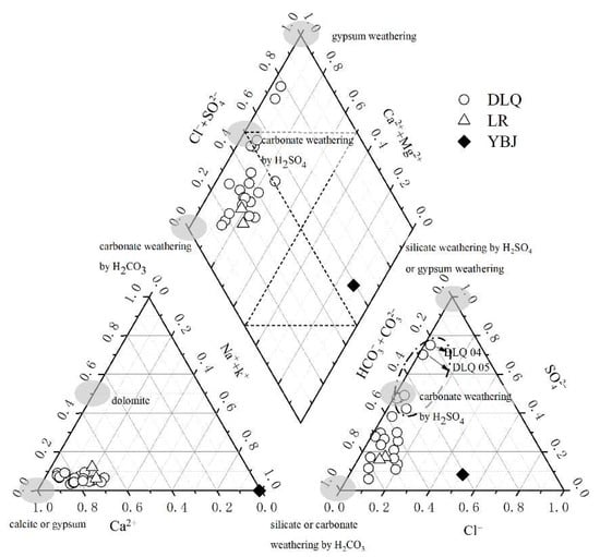 The dominant anion and cation in YBJ geothermal water were Na+ and Cl–, respectively (Table 2), and the water chemical type was Cl-Na type (Figure 2). This might be because the alkaline solutions are prone to dissolving silicates, and the interaction of alkaline water with rock minerals (mainly granite in the deep layer of the YBJ geothermal field) lead to an increase in the concentrations of SiO2, Na+, and K+ [26]. Ca2+ accounted for the highest total cationic equivalent charge of 63~87% in the river water of the DLQ, followed by Na++ K+ (4–26%) and Mg2+ (3–9%), while (22–84%) was the dominant anion, followed by (6–75%) and Cl– (2–19%). Therefore, 78% of the water samples in the DLQ belong to the -Ca types, and 22% of the water samples are SO4·Cl-Ca types. The water samples in the DLQ near the YBJ geothermal water belong to the SO4·Cl-Ca type, indicating that the contribution of solutes in the geothermal field cannot be ignored. Previous studies have shown that geothermal water contains high concentrations of Cl– [27,32]. In this study, the Cl– concentration in YBJ was as high as 440.7 mg/L (Table 2). In addition, the highest concentrations of (52.1 mg/L) were observed near the YBJ geothermal water, which is mainly due to the fact that the H2S and SO2 contained in the geothermal water are easily oxidized to form during the upward migration process [27,52]. The water chemistry of the DLQ gradually changed from the SO4·Cl-Ca type to the HCO3-Ca type with the direction of water flow, mainly due to more dissolved carbonate flowing into the river and the dilution of and Cl– in the river. Ca2+ was the dominant cation of river water in LR, accounting for 69–71% of the cations, while was the dominant anion, accounting for 71–74% of the anions. Thus, the water chemistry type of LR is HCO3-Ca, which is consistent with previous studies [5,22], indicating the important contribution of carbonate weathering to the ionic composition of river water in LR [13].