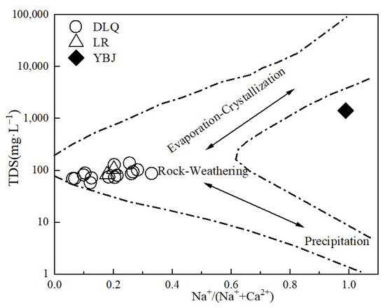 The Gibbs graph of major ion compositions in DLQ, LR, and YBJ geothermal water.