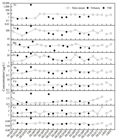 The spatial distribution of different heavy metals of river water in DLQ demonstrated that (Figure 4), except for the YBJ geothermal water, the concentrations of heavy metals in other Sampling sites are generally low (Table 3). Overall, the concentrations of As, Fe, Mn, Zn, Pb, and Cu of river water in DLQ increase after the inflow of YBJ geothermal water, indicating the contribution of geothermal water, while the decrease, afterward, was mainly due to the water self-purification and the inflowing of the tributaries. In addition, the concentration of heavy metals (except As) of river water in DLQ increased again after passing near the towns of Dongga and Naiqiong (DLQ12), which reflects the influence of sewage input from the towns.