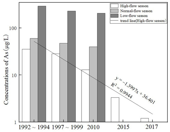 From 1992 to 2017, the As concentrations in the river showed a decreasing trend (35.5 g/L~1.2 g/L) during the high-flow season, which may be related to a significant increase in precipitation and runoff due to climate change. In addition, from 1992 to 2010, the most significant reduction was found in the high-flow season (35.5 g/L~12.9 g/L) compared to the normal-flow season (59.9 g/L~40 g/L) and the low-flow season (292 g/L~205.6 g/L), which was primarily caused by the stronger dilution of the river in the high-flow season [25]. Therefore, based on the variations in As concentrations in this study, it can be inferred to some extent that the recent increase in precipitation and runoff in LR caused by climate change may lead to a decrease in the concentration of heavy metals in river water. Similarly, metal concentrations in the Rhine River were diluted by the river due to climate change as observed by Zwolsman et al. [72].