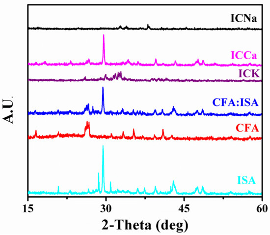 The sharp and prominent peak near 28° disappeared from ICK. Moreover, the peak near 25–28° also disappears from the sample after KOH treatment and sintering. Only a small peak was present near 30 and 32–35°, which could be due to iron oxides. While ICCa retained the sharp peak of ISA, which is shown at 28° even after Ca(OH)2 treatment. It has also retained the peak near 25–27° from CFA, but its intensity gets reduced. In addition to this, it has a small intensity peak at 37, 40, 42, and 47°, which are attributed to carbonates. The sharp peak from ISA near 28° completely disappeared from the ICNa sample. It also does not have a peak near 25–27° from CFA. In addition to this, there was the formation of several large-intensity sharp peaks from 32–37°, which are attributed to the iron oxides and carbonates. In addition to this, it also shows the zeolitic nature, especially Na-based zeolites, after NaOH treatment [30,75,76].
