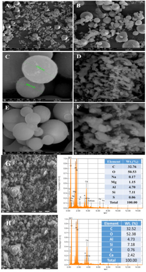 FESEM images of an ISA: CFA mixture sample (A–F) and EDS spot (G,H).