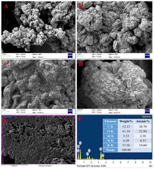 Figure 5A–D shows FESEM micrographs of KOH-treated CFA: ISA particles. Figure 5A–C clearly shows images of micron-sized fused particles. These are aggregates of CFA:ISA particles that got transformed after KOH treatment. Figure 5D shows an aggregate of cuboidal-shaped particles whose size varies in the range of 80 nm to 300 nm in length and 10–40 nm in width. The image clearly indicates the transformation of the ISA:CFA particles into the zeolite. The morphology of the obtained particles is similar to the previous work reported by Yadav and their groups, where ISA was made ferrous-free and treated with dilute sulphuric acid followed by NaOH treatment. Here the final developed particles were cuboidal to rhombohedral in shape, whose size was 100–700 nm. The EDS revealed the formation of calcium-rich zeolite, i.e., gismondine [76]. There are previously several articles that clearly reported the formation of zeolites from CFA particles by using KOH.