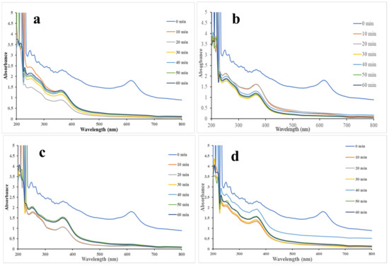 From the UV spectra shown in Figure 6, it is clear that the concentration of MGD is continuously decreasing from 0 min to 60 min. The concentration of dye was highest at 0 min and became colorless after 40 min only.