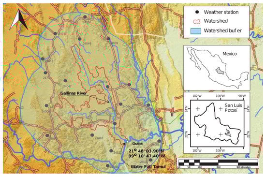 The delimitation of the basin is depicted in Figure 1, where the nozzle is located at the Tamul cascade. In this Figure, the main channel or primary collector is blue colored, while the wedGallinas sub-basin delimitation is red. The basin is large-intermediate, and it possesses a type B hypsometric curve, which means that it is a basin in equilibrium (maturity phase). The main features of the basin can be observed in Table 1.