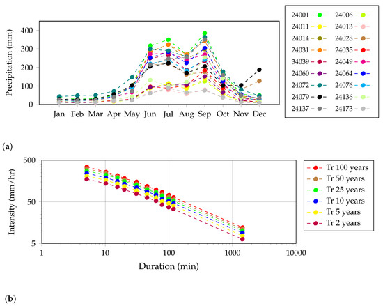 Precipitation of the watershed of the study zone. (a) Average monthly precipitation values for the time period under study. (b) Intensity-Duration-Return Period curves (I-D-Tr).