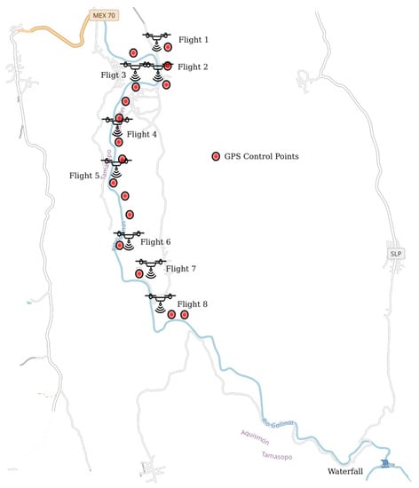 Location of the flights performed to determine the topographic survey and demarcation of the river.