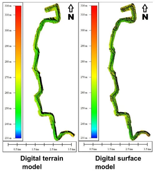 Photogrammetry was performed through Agisoft PhotoScan Professional to obtain a 3D model with texture. Two Digital Elevation Models were generated, both of surface and terrain. Each DEM is given as a raster image in Tiff format at a resolution of 0.0709391 × 0.0709391 m for each pixel. After that, employing the ArcGIS software, the resolution was reduced to a value of 0.5 × 0.5 m to speed up data processing during the generation of the meshing in modeling. Both DEMs can be observed in Figure 4.