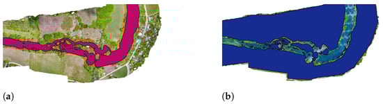 GIS views delimitation. (a) GIS view with the water surface polygon bounded with the orthophoto. (b) GIS view with bounded terrain surface polygon with the orthophoto.