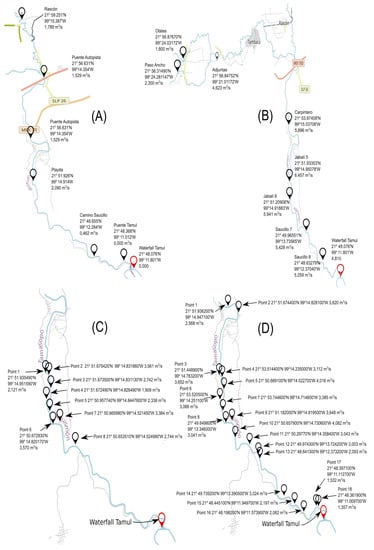 Location of the flow measurement points for the four campaigns. (A) First campaign locations. (B) Second campaing locations. (B) Second campaign locations. (C) Third campaing locations. (D) Fourth campaign locations.
