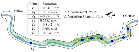 Based on the results of the uncalibrated results, many simulations were performed with flow correction in specific points. Figure 7 shows the measurement points (with the prefix “P”) and the introduction of flow variations (with the prefix “V”) in the length of the modeled section of the Gallinas River.
