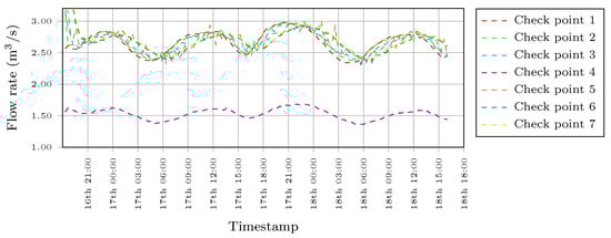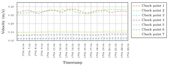 For this research, the flow and velocity time series analysis was required to calibrate the model. Seven control points were used to perform the records; their location are shown in Figure 7. In Figure 8, graphs of time (days) vs. velocity (m/s) recorded in the seven checkpoints for a specific period of time. Such checkpoints are used to calibrate flows passing the defined control points. Analogous, the flow rates are shown in Figure 9.