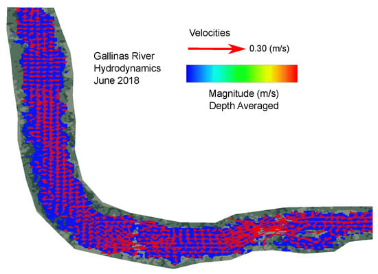 Velocity fields in a section of the model, 6 June 2018, at 21:10 h. The change in magnitudes due to the variation in the width of the section as well as the presence of waterfalls along the riverbed can be observed. Image generated using EFDC Explorer.