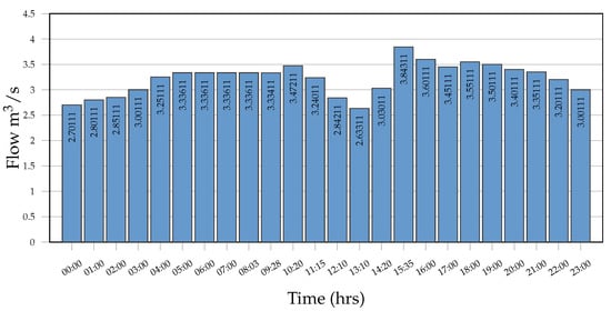 To perform the model’s calibration, data from the measurement campaign of August 2018 were used. For this validation, the hydrogram shown in Figure 11 was introduced as an inlet, which corresponds to August 2018. The flow is more significant than that presented in June due to the rains. It must be remarked that only the inlet boundary condition is altered for validation purposes.