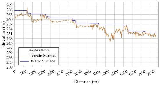 The longitudinal profile of the river was also determined, showing the elevation of the land surface and the water surface in meters above sea level. Figure 12 shows the elevations of the water and ground surface collected in the field campaign of 18 June, obtained directly from the measurements.