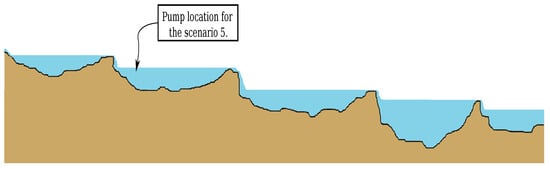 During the measurement campaigns, the seven located pumps had a 10 in pipe, yielding a capacity to extract up to 1,000,000 L per hour. Depending on the pump capacity and the assigned water requirement per pump, it would be necessary to keep the pump running for 8 h to meet the demand. The location of the pumps is shown in Figure 19, while the allocation of irrigation periods per pump is carried out randomly between 5:00 a.m. and 9:00 p.m., and can be observed in Table 6. The initial conditions of the model are the same as in the previous scenarios. The results of the simulation can be observed in Figure 20.