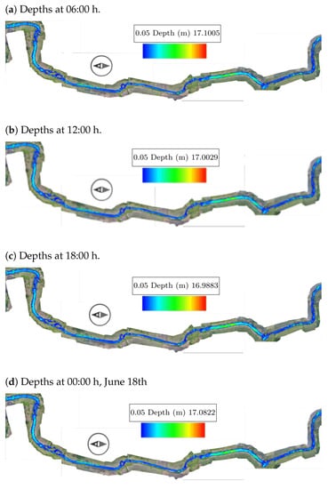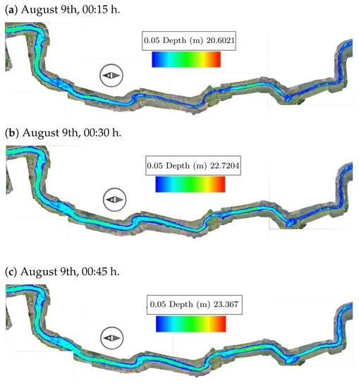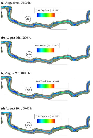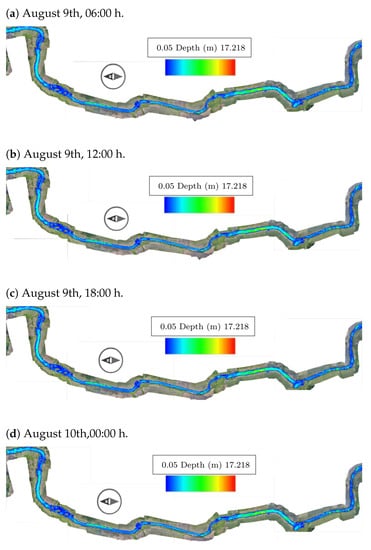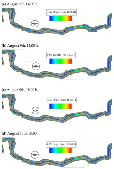 This scenario represents the increased inflow due to heavy precipitation in the Gallinas sub-basin, expressed as flow in the model at 00:00 h on 9 August. Figure 15a–d show the river understudy’s time evolution for 24 h under this inflow scenario. The flow stability is reached after 24 h.