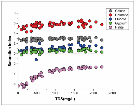 Silicate weathering considers the primary geochemical process influencing the hydrochemistry of significant ions, particularly in aquifers of hard rocks [77]. The concentrations because of silicate weathering could be evaluated by the bivariate plot of Ca+ + Mg+/TZ+ (7d). The scatter plot (Figure 7d) shows that most samples fall above and towards the Ca2+ + Mg2+ = 0.5 line, indicating the predominant role of silicate weathering in geochemical processes. In contrast, some samples lie below the Ca2+ + Mg2+ = 0.5 line, which indicates that the abundance of Ca2+ + Mg2+ is probably due to the contribution of reverse ions exchange and weathering of carbonate minerals [78,79].