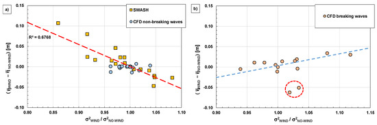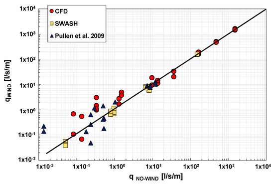 In Figure 17, the effect of wind is seen to increase with reducing the overtopping regime; this result is in qualitative agreement with [5], and can be explained by the fact that the influence of the droplets’ advection on the mean overtopping rate increases with reducing q. However, the results of CFD experiments differ from Pullen et al.’s in two essential points, namely: