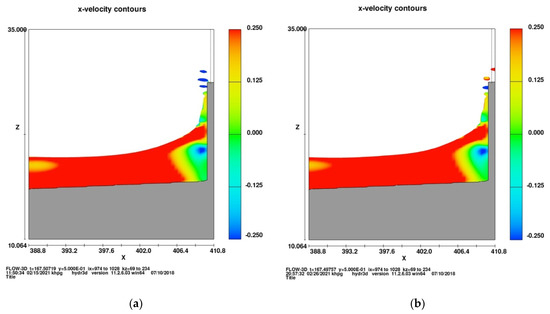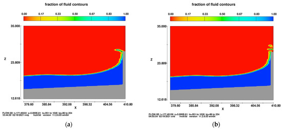 The CFD RANSE model was found to address all the above processes realistically. According to [7,25], the numerical experiments have shown that the wind stress gives rise to higher up rushing jets, and pushes forward the water spray that would otherwise have fallen back into the sea (Figure 5). This can be considered one of the leading mechanisms for the increase of the overtopping rate by wind.