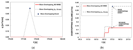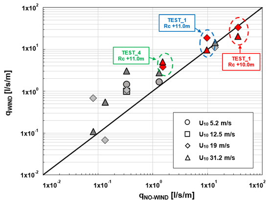 In particular, the smaller the mean overtopping discharge, the greater its growth rate due to the presence of wind. Therefore, the wind has a different influence on the “green overtopping” (when the wave overtopping runs over the crest of the structure in a coherent water mass) and the “white overtopping” (a non-continuous overtopping and/or a significant volume of spray) [2]. As previously reported [2], a mean overtopping discharge below 1 l/s/m might increase up to four times under strong winds. Since this order of magnitude represents the threshold for structural damages and pedestrians and vehicles safety (which can be endangered by the presence of water spray due to the wind that may reduce visibility on highways and roads) [2], a significant growth in the mean overtopping discharge due to the wind needs to be considered in the design process.