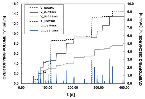 Among the physical model studies, ref. [3] used a paddle wheel to “push ahead” the water reaching the crest of a vertical wall. The authors observed that part of the breaker spray, which would have fallen back into the sea without wind, was blown, instead, over the structure. It was found out that this process can increase the mean overtopping discharge (qNO-WIND) by a factor of 3.2.