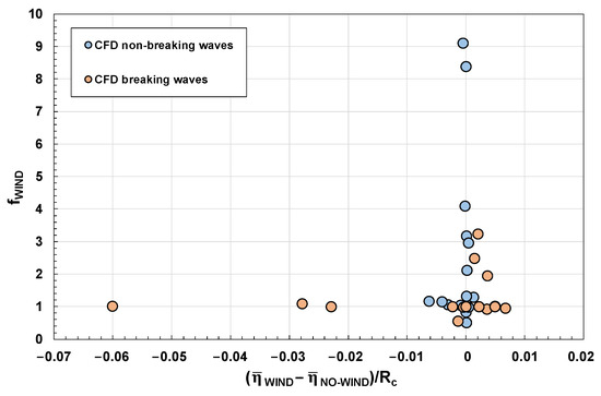 It is worth highlighting that the observed behavior is practically independent of the variations in the mean water level discussed in Section 5.2. This is shown in Figure 18, where the largest values of the wind factor are attained with no difference between and . Conversely, the opposite is found with growing the variation in the mean water level (e.g., −0.06 Rc), fWIND = 1.