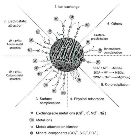 The main adsorption mechanisms of biochar and modified biochar for heavy metals include physical adsorption and chemical adsorption. Physical adsorption is mainly based on the specific surface area or van der Waals force. However, they can be ignored because of their weak effects []. The specific adsorption mechanisms of biochar and modified biochar for heavy metals are shown below.