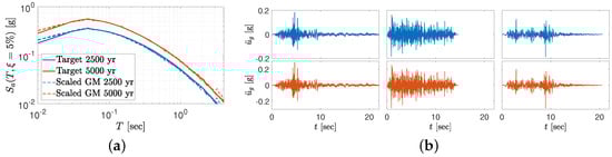 - FEMA recommendations Time-based performance assessment evaluates a dam’s performance over a period considering all earthquakes that may occur in that period, and the probability that each will occur [73]. This procedure follows the following main steps: (a) generate a seismic hazard curve, i.e., vs. , (b) compute seismic intensity range and split it into equal intervals, (c) develop a target response spectrum, , for each intensity range, and (d) select and scale suites of ground motions for each spectrum.