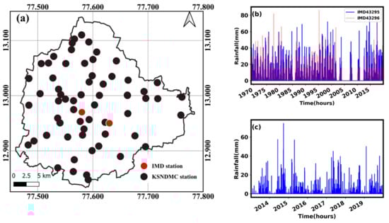 The hourly rainfall data from the IMD stations in Bangalore—IMD 43,295 and IMD 43,296—are available from 1969 to 2019. The KSNDMC provides real-time weather-related information, forecasts, early warnings, and advisories for the management of natural disasters in the state. The KSNDMC has installed over 6000 telemetric rain gauges (TRGs) and more than 750 telemetric weather stations (TWSs) across the entire state to transmit data every 15 min. The hourly rainfall data from 51 KSNDMC stations over Bangalore were considered from the years 2010 to 2019. The locations of the IMD and KSNDMC stations are shown in Figure 1a. For demonstration, the rainfall time series for the two IMD stations and one representative KSNDMC station (TRG2309) are shown in Figure 1b,c, respectively. Additional details related to the IMD stations, originally mentioned by Rupa and Mujumdar (2018), are provided in Table 1.