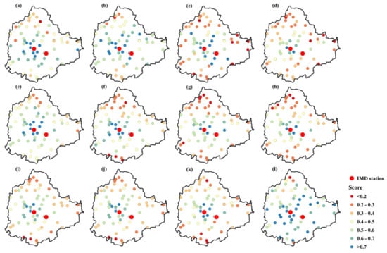 Performance of the random forest model shown for 12 months ((a–l) January–December). The coefficient of determination values for the KSNDMC stations are marked in various colors. Additionally, the locations of the two IMD stations are marked in red.