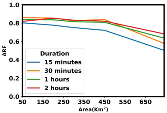 The equation for ARF was obtained from the work of Allen and Degaetano, 2005. In this study, durations of 15 min, 30 min, 1 h, and 2 h were considered for the areas ranging from 100 km2 to 740 km2. The circular area was calculated using the procedure suggested by Allen and Degaetano in 2005 [34].