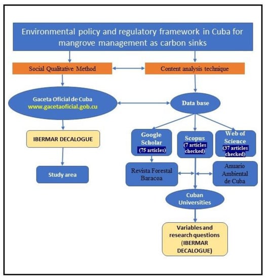 We used qualitative method research This method uses a deductive and logical scheme that allows for the development of research questions, to later test them [] (see Figure 1). This is an exploratory investigation, whose units of analysis are public documents (scientific articles, legal instruments, official documents, official sites of Cuban institutions) about current Cuban policies related to the use of mangroves as carbon sinks and their role in addressing CC. The materials were analyzed objectively and systematically, and valid inferences were made for the Cuban context. The validity and reliability are measured by the methodological coherence assumed by the authors. Starting from a research question valid for the expected results and findings found the validity and reliability are measured by the methodological coherence assumed by the authors.