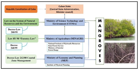 In Cuba, there are no specific institutions or collegiate bodies to manage the mangrove as a carbon reservoir. The leadership of environmental initiatives is the responsibility of CITMA, as indicated in the new law on the Natural Resources System and the Environment []. According to current environmental legislation, a set of institutions can also be held responsible (Table 4), which would allow for the establishment of structures and a basis for the management of the mangrove as a carbon reservoir, although the administrative process is not designed to address the problems and conflicts of the mangrove in this case, as shown in Figure 3.